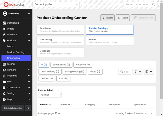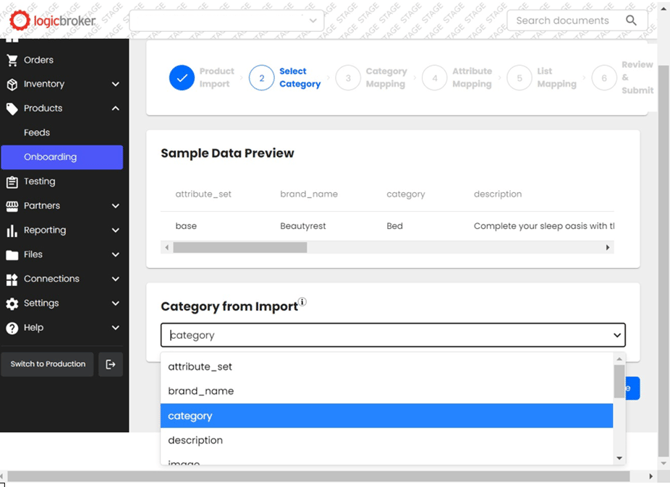 - Navigate to the portal. Ensure you are in the staging environment by either accessing the portal through this link https://stageportal.logicbroker.com/ or clicking Switch to Staging at the bottom left of the page once logged in, if visible. Select Products from the left-hand side toolbar. Select Onboarding from the dropdown.