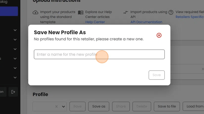 - Provide a name for the profile. This profile will be used to save all of the mapping done in the upcoming steps so the work done upfront can be reused in future product imports. Once the profile has been named, click "Save".