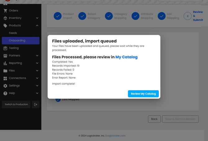 - If there were no errors within the data, you will see the message below explaining that your import was successful. You will then be prompted to navigate to your catalog by clicking on Review My Catalog.