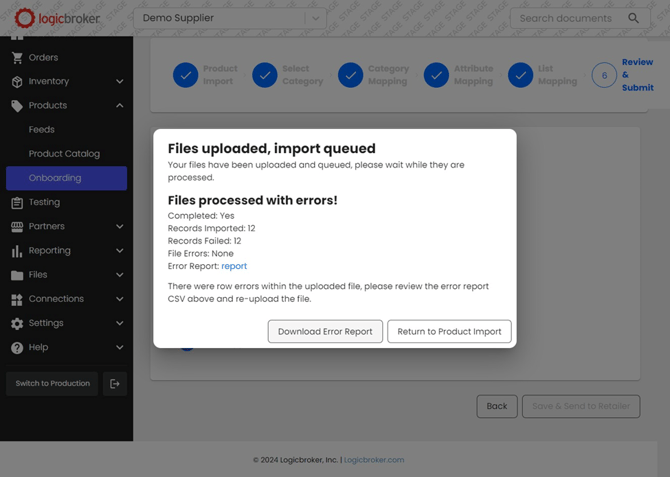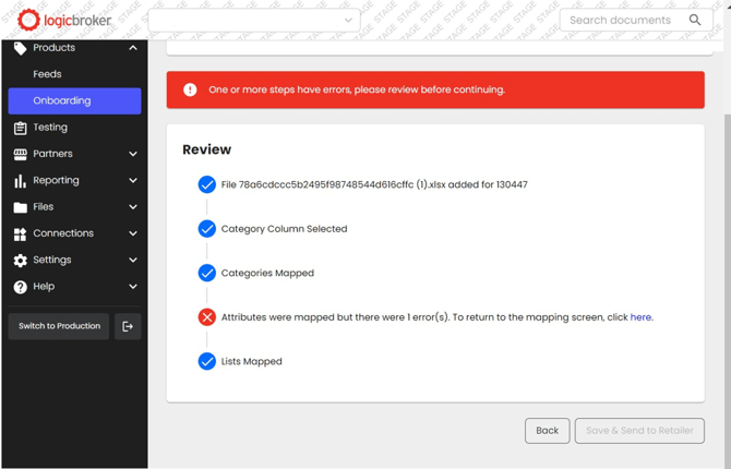 - Once you have walked through each of the steps, you will be brought to the review page shown below. Logicbroker performs front-end validation, meaning we check for any missing attributes or attribute types that are mapped incorrectly. If there are any errors, you will see a red "X" on the respective step. Click on the “here" button, shown below, to be brought to the step that needs updating and make any edits listed on the page.