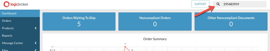 - Option 1: Using the Search bar at the top of any page in the Portal, enter in the order number. This will pull up all related documents to the order (the order as well as any existing shipments, returns and/or cancellations).