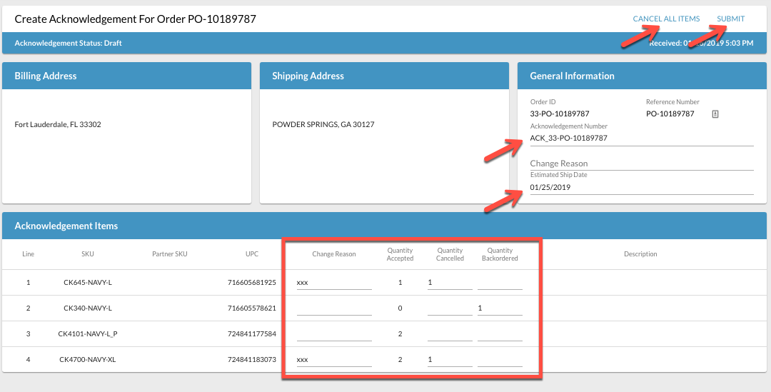 - To cancel items, go to the Acknowledgement Items section and update the Quantity Cancelled field with the quantity you want to cancel/reject for that line.