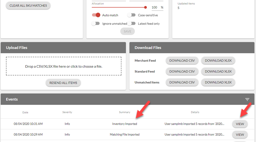 6. From the Events section, you can see that your file successfully loaded and you can review the file that was uploaded by clicking on View.