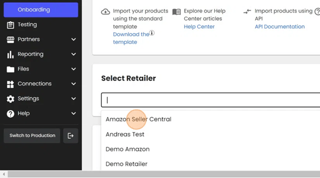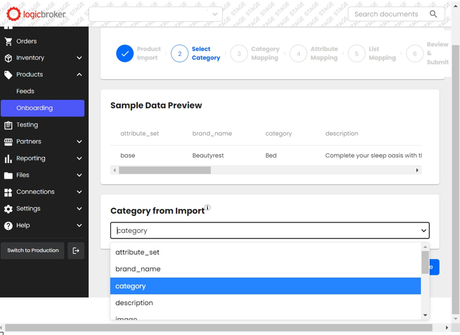 - Navigate to the portal. Ensure you are in the production environment by either accessing the portal through this link https://portal.logicbroker.com/ or clicking Switch to Production at the bottom left of the page once logged in, if visible. Select Products from the left-hand side toolbar. Select Onboarding from the dropdown.
