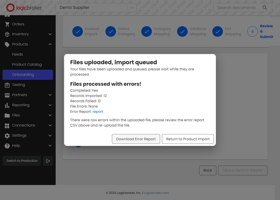 Once you have walked through each of the steps, you will be brought to the review page show below. Logicbroker performs front end validation meaning we check for any missing attributes or attribute types that are mapped incorrectly. IF there are any errors, you will see a red x on the respective step. Click on the “here" button, shown below to be brought to the step that needs updating and make any edits listed on the page.