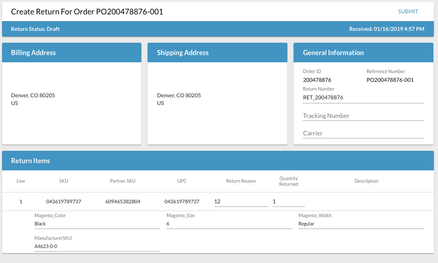 3.You will be taken to the Create Return page. This is where you will create a return from an order.