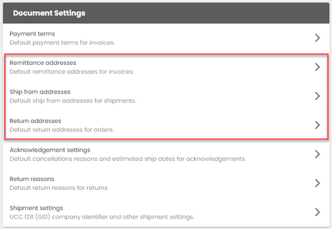 You can set up default or partner-specific remittance, ship from and return addresses. For more information, see Document Settings.