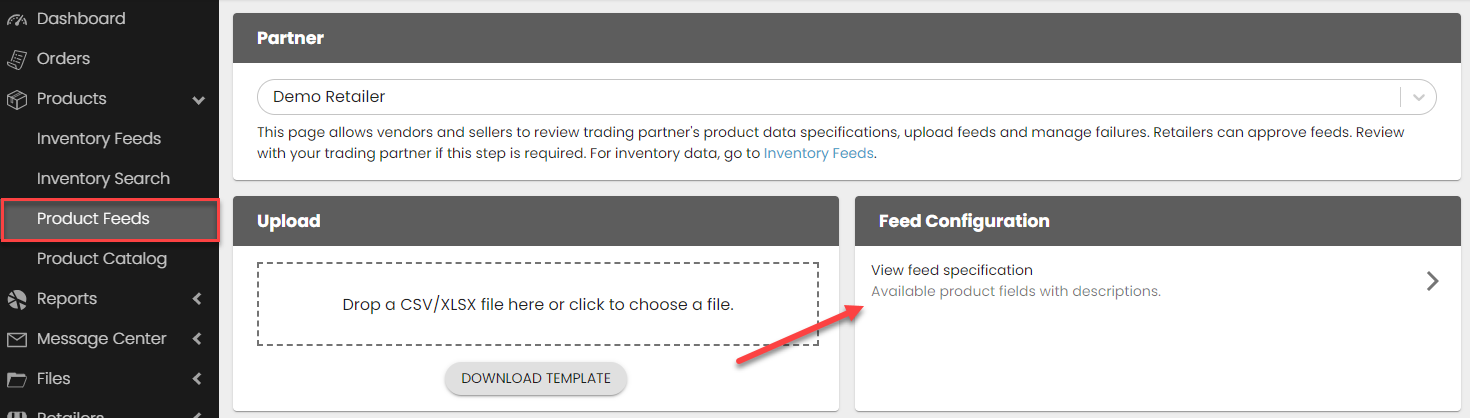 - Through the portal: Upload your template file into the portal from the Product Feeds page > Upload