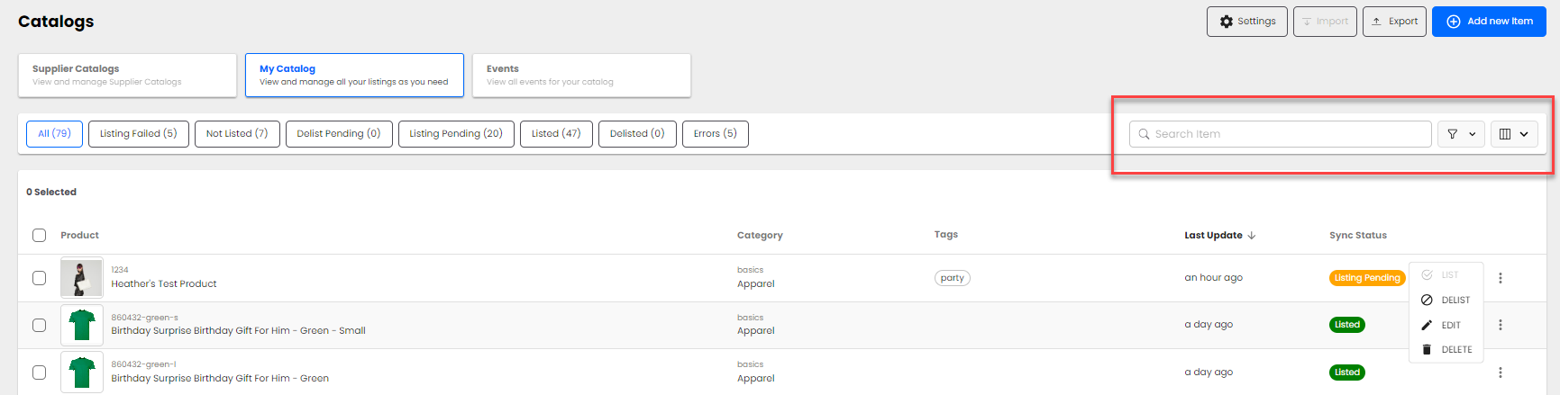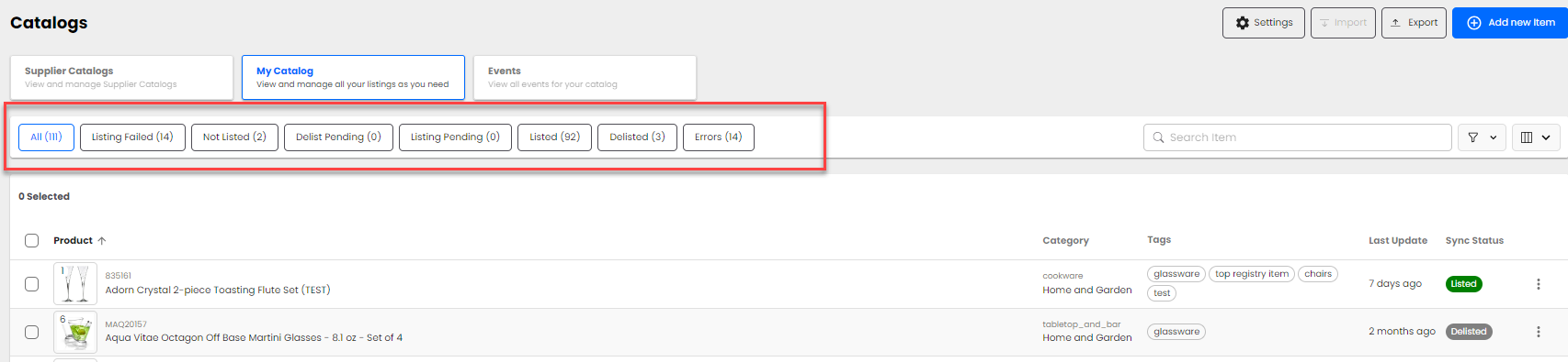 The products brought into My Catalog have already gone through the Product Review Process and are now in the Product Listing Process. When interacting with My Catalog, you are presented with quick filters at the top of the screen to determine which products are in which statuses easily.