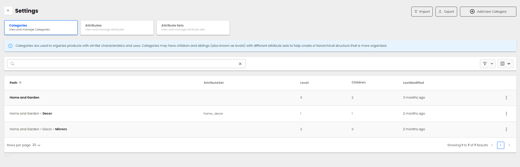 Categories are used to organize products with similar characteristics and uses. Categories may have children and siblings (also known as levels) with different attribute sets to help create a hierarchical structure that is more defined.