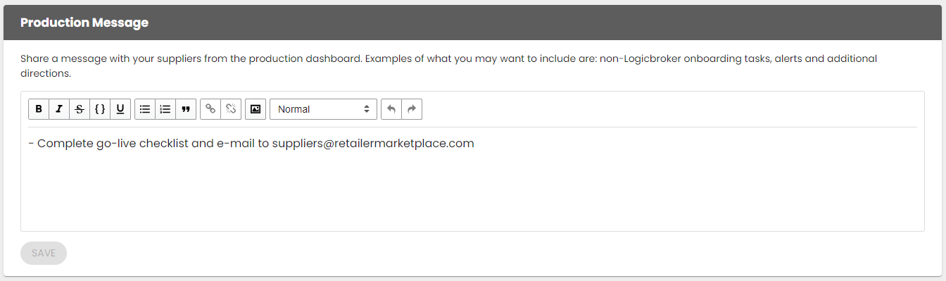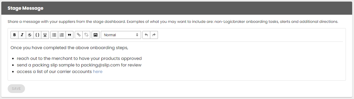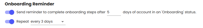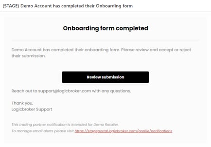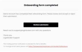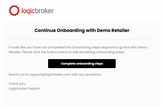 - Onboarding Reminder: If enabled, Logicbroker will automatically send an onboarding reminder to the supplier after they've been in an 'Onboarding' status for x amount of days. Email subject: Reminder to complete onboarding steps for [Retailer]