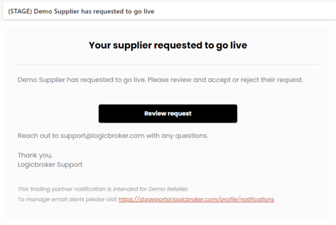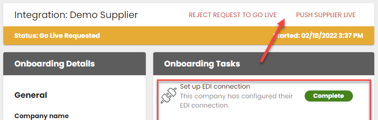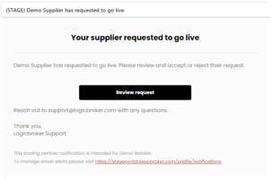 You will receive an email with the subject line Supplier has requested to go live. Click on Review request or find the supplier’s onboarding task in the portal to Push supplier live or Reject request to go live.