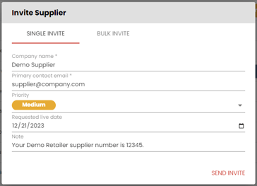 From the Onboarding page, click on Invite Supplier (single or bulk) and fill out the invite.
