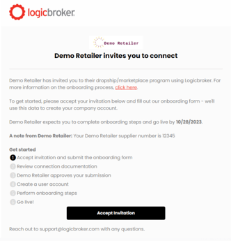 The supplier will receive an email an email with the subject line Supplier has been invited to connect with Retailer. This email includes a brief introduction to Logicbroker, a link to our Onboarding Overview article, the expected go-live date, any custom communication you added in the Note section of the invitation and an overview of where they are in the onboarding process. The supplier will click on Accept invitation to fill out the Onboarding form.