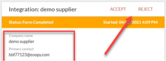 If rejected: enter in the rejection reason. The supplier will receive an email notification with the opportunity to go back and review onboarding steps. You will be notified when they request to go live again.