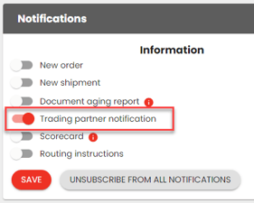 To receive supplier onboarding notifications, turn on the Trading Partner notification from the Notifications page in the stage portal. The notifications you will be subscribed to shown below. Note: Notifications are sent through email and need to be set up on an individual basis.