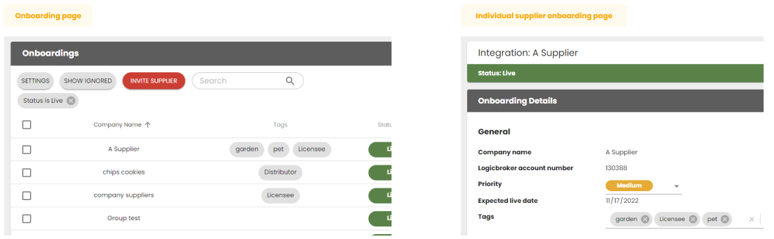 - Add Suppliers to Test Groups: You can assign a supplier to a test group (which will show/hide test cases according to the test group setup) at various points during the onboarding process: