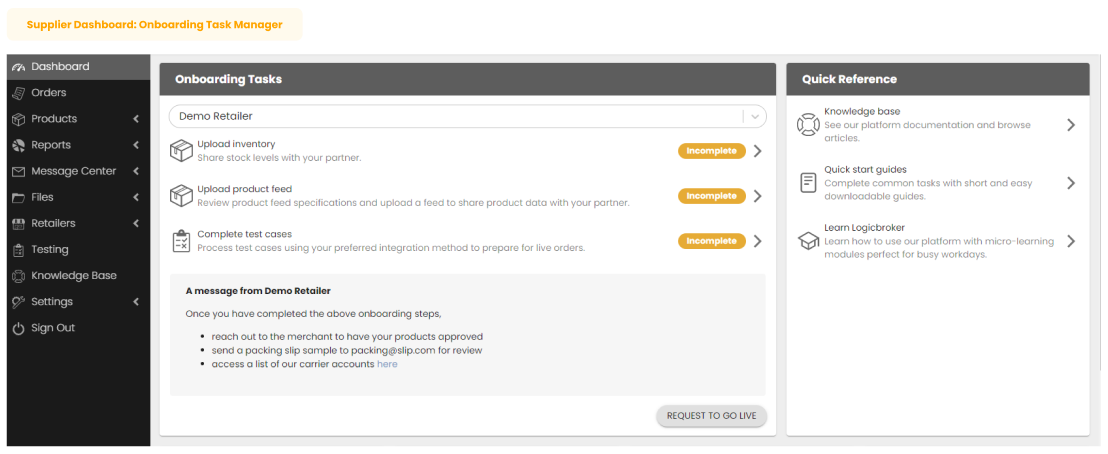 On-Demand Onboarding is available in stage for Logicbroker retailer customers. For more information on this process and to see a demo, please reach out to support@logicbroker.com.