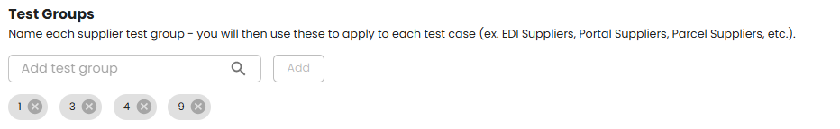 - Create Test Groups: Similar to tags, create groups by deciding a name for each supplier group and clicking 'Add' (ex. EDI Suppliers, Parcel Suppliers, etc.)