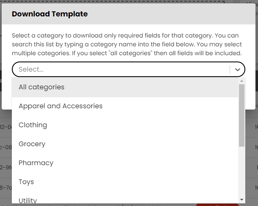 Download a template from the Product Feeds page > Upload > Download Template > select All categories or a specific category depending on your assortment.