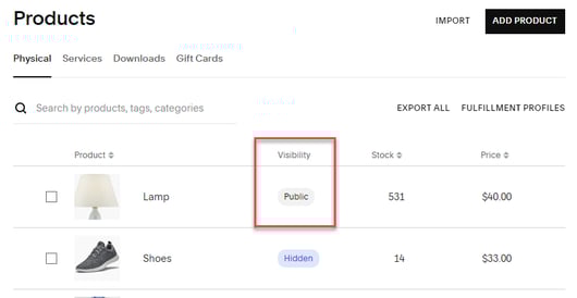- In Squarespace, make sure all the products you want to share with your partner are in a Public status.