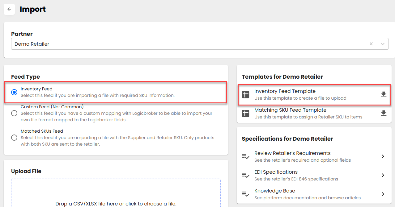 - Portal Suppliers: Go to Import > Templates > download the Inventory Feed Template > fill it out