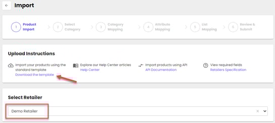 - Download a template: Go to the Product Onboarding Center > Import page > select your retailer > 'Download template'