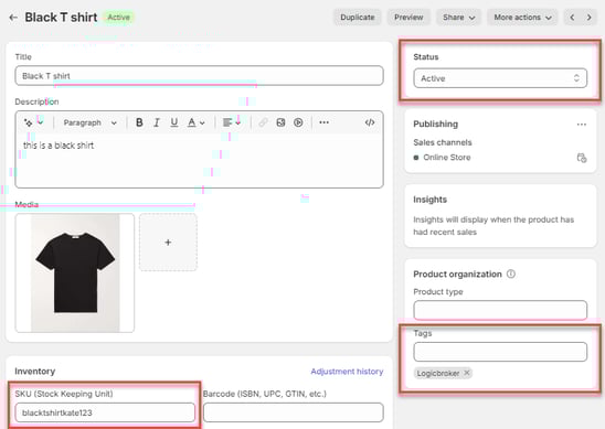 - In Shopify, make sure all the products you want to share with your partner are in an Active status, have a unique SKU and are tagged with 'Logicbroker'