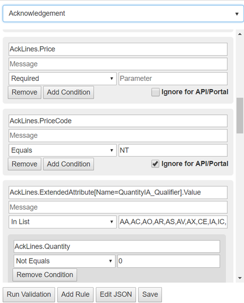 Validation being ran on an acknowledgment document, ensuring all fields required by a retailer are present.