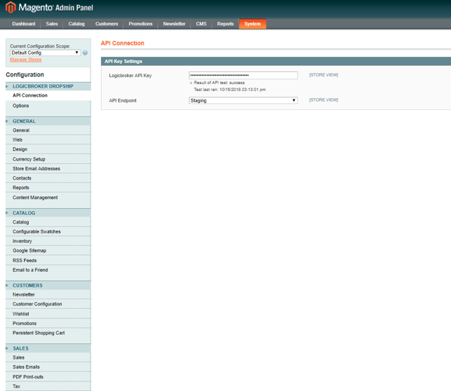 Now that you have the Logicbroker extension installed, you need to configure it with your Logicbroker API key before it can communicate with the Logicbroker system. This API key can be generated and found in the Logicbroker Portal. When you add your API key to the configuration, it will automatically test the connection for you, so you can see immediately if there are any problems.