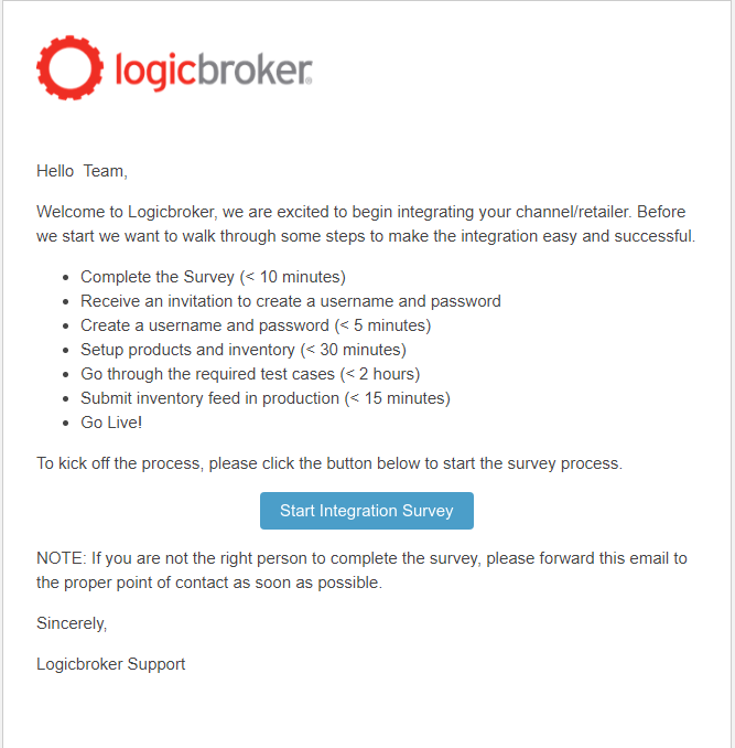 Logicbroker has an automated follow-up system, that will automatically remind users to finish their implementation process. This can be scheduled at any time after a user is initially contacted. |