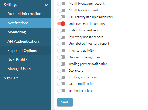 As a leading EDI provider focused on supply chain and eCommerce procurement, Logicbroker strives to provide visibility to transactions and the associated documents for our clients. However, there are certain EDI documents that fall outside the scope of standard integrations. To avoid custom mapping or development charges for our clients, Logicbroker simply passes an unsupported document via email as an attachment. Please be sure that you are subscribed within the Logicbroker portal to receive this email. You may find this by going to Settings > Notifications and ensure that Unknown EDI documents is turned on and hit Save.