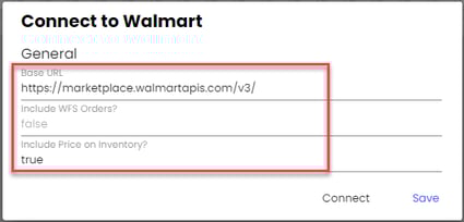 - Under the General section, select a Base URL using the dropdown (Note: using the sandbox URL will only provide sample responses from Walmart during testing)