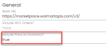 - Through Inventory: Sellers will update the Logicbroker Cost field on Inventory and this updates the Walmart Marketplace Price field on their site. To send pricing updates through Inventory, go to Connections > Connectors > Walmart > General > Include Price on Inventory > set this to true
