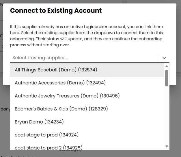 The retailer can select which existing supplier they want to tie that onboarding to (the list will not show suppliers that are actively onboarding or live)