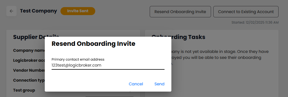 Once connected, the page will update with the existing supplier's data and be pushed into an Onboarding status - all onboarding tasks will also be updated with the supplier's progress so far
