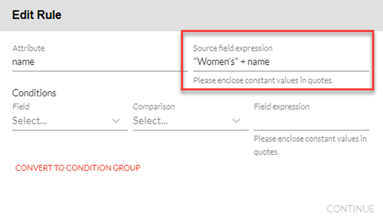 - Add the Source Expression Field. This is the transformation you would like to make to your data. The value you are looking to how you want the data to appear in the product feed file. For example, if you are selling clothing and wanted to easily distinguish that the items are women’s clothing you can add this before the product name. The expression would be “Women’s” + Name, as shown in the image below. Be sure to enclose the constant values in quotes. Once complete, click continue.