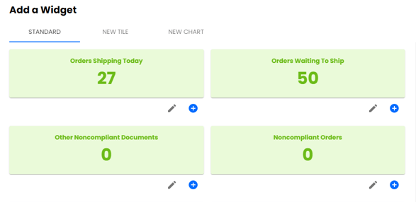 Click on New in the top right to open up the Widget dialogue. This will allow you to customize your dashboard view by viewing, editing or creating new tiles to your dashboard.