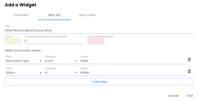 Filter - this determines what data is being showcased on the tile. There are various options, shown below, and users are able to add multiple filters.