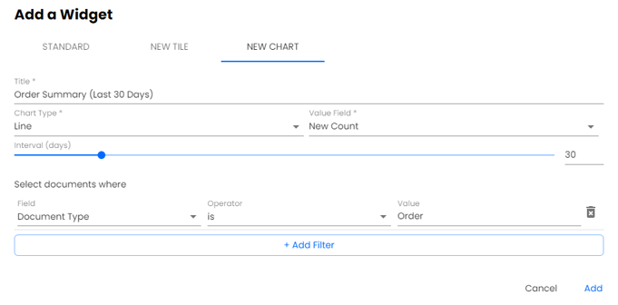 Value Field – this determines what you are trying to view on the chart I.e., a count of new documents. All value options are listed below.