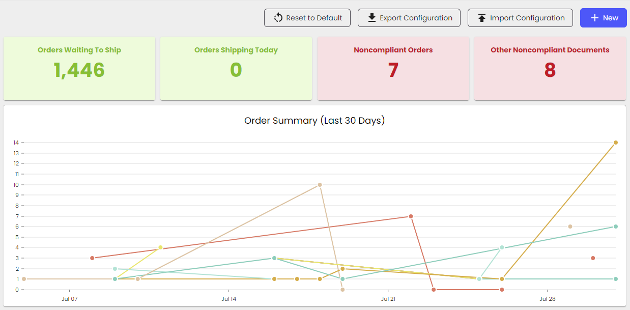 The Logicbroker Dashboard provides users with a customizable view of order processing data including high-level summary of orders, failed documents and a quick visual snapshot into order information and financial stats. Retailers and suppliers alike should monitor the dashboard daily for document failures. If you are using another system to process orders, you should still monitor this page as failed documents may not be sent to your system until failures are resolved.