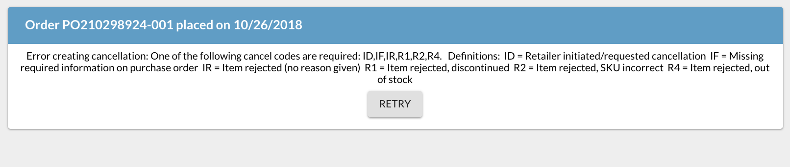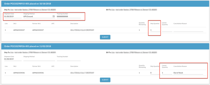 NOTE: Depending on the retailer, you may be required to enter in a specific cancellation code in the Cancellation Reason field. Additionally, some retailers may not allow partial shipment or cancellation of an item and/or order. You will receive an error message if you attempt these actions and there is additional information required.