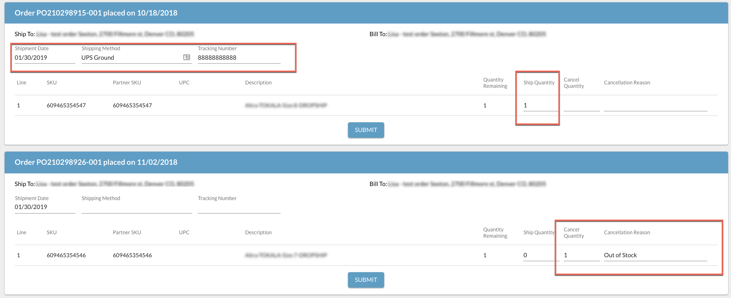 3. All shipments default to all items on the order shipping. If you want to do partial shipments, you can adjust the Ship Quantity to reflect what actually has shipped and leave any items that haven't shipped with a Ship Quantity of zero. If you want to ship part and cancel part, or cancel entirely, adjust the Cancel Quantity and Ship Quantity for each item. For any cancelled items, enter in a Cancellation Reason.