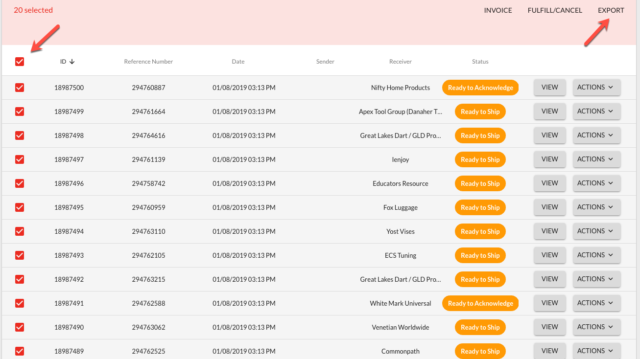 2. To properly upload your tracking information and create new shipments, you will need to export your orders via the Order Management page. With your orders selected, click on Export.