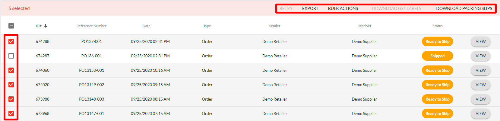 NOTE: You can adjust how many orders are visible on a page and you may also filter by status to only show orders in a "Ready to Ship" or "Ready to Acknowledge" status.