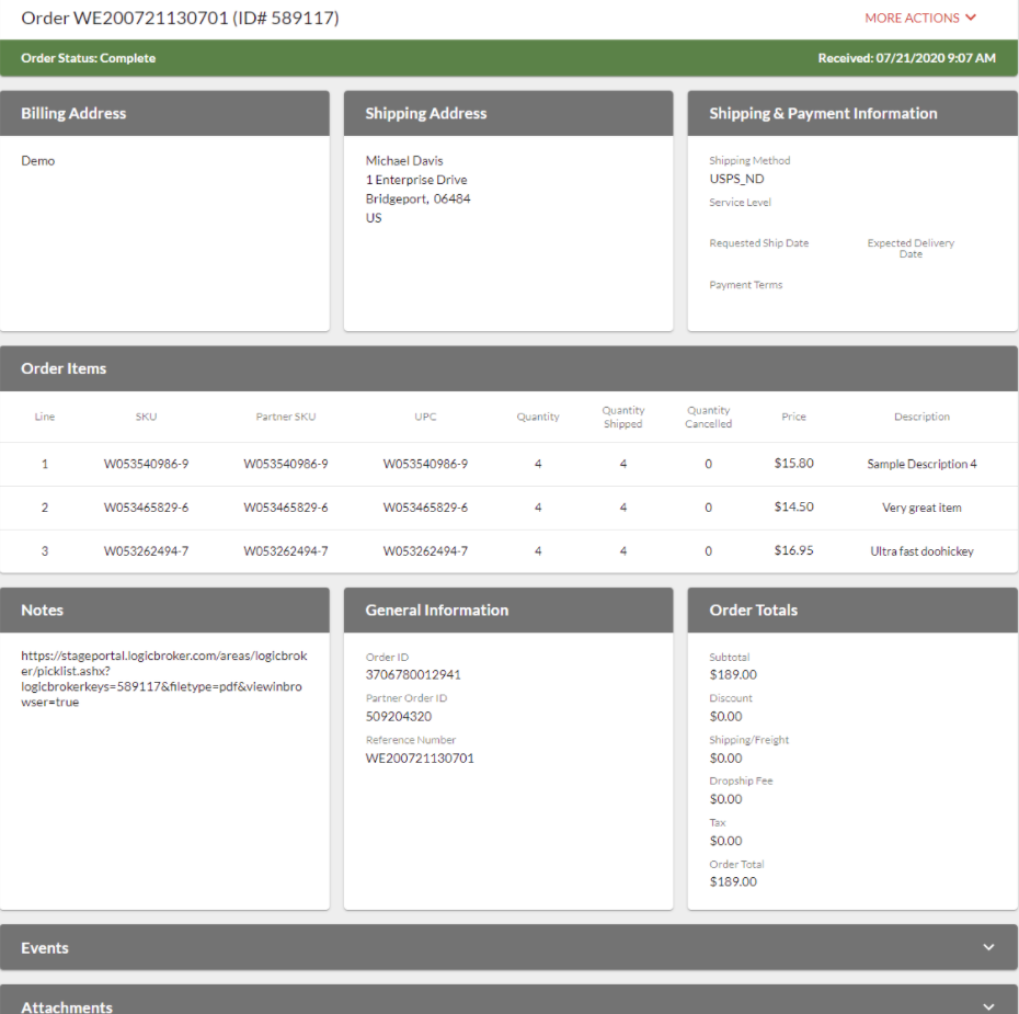 - The Events section will display key actions taken on the order and the Attachments section will display documents, such as the XML files related to the order.