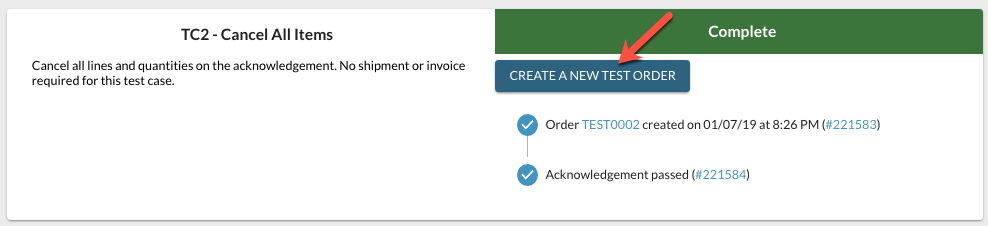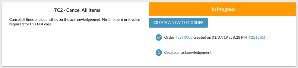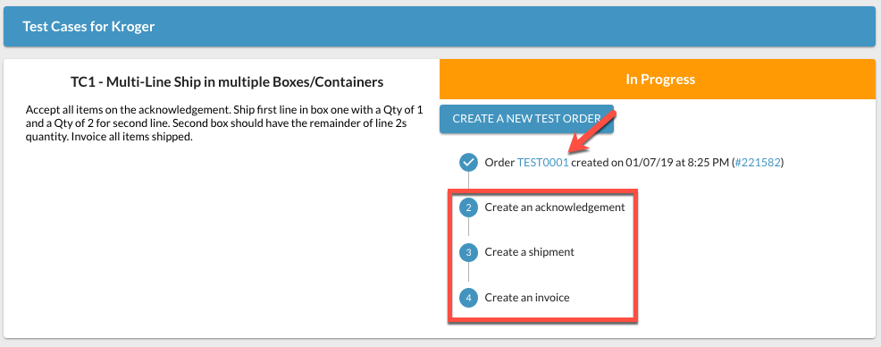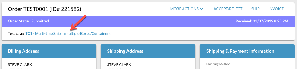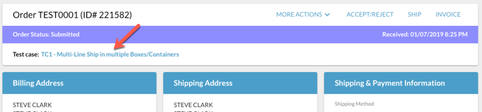 - NOTE: Once you click on the order, you can see at the top of the order a link that takes you back to the Test Case page. It may take a moment (less than 30 seconds) for the test order to be "ready" to start taking action on.