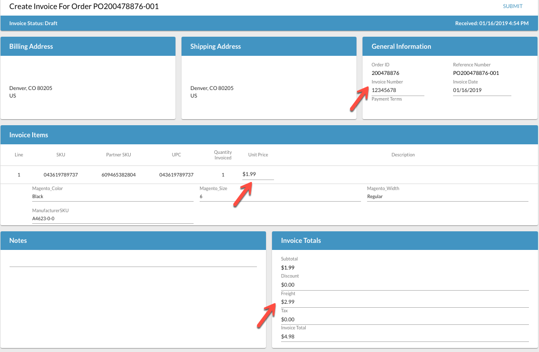 4. Follow the normal steps to create an invoice and click Submit.