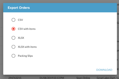 NOTE: If you choose to export "with items", you will have the ability to select which items ship. If you only choose without, when you upload the file all items will get marked as shipped for that order.