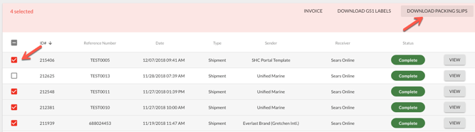 5. Click on Download Packing Slips. A PDF file will generate with all the packing slips associated to those shipments.
